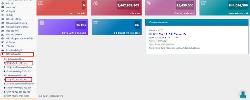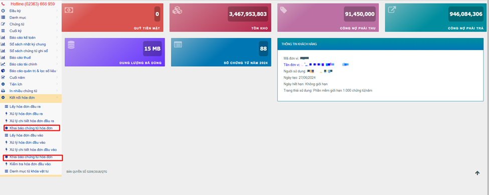 Bước 1: Tại menu Kết nối hoá đơn, người dùng tiến hành Khai báo chứng từ hoá đơn đầu ra/ đầu vào để sau này xử lý, đưa các hoá đơn lấy về từ Tổng cục Thuế vào chứng từ phù hợp. Chỉ cần khai báo 1 lần duy nhất