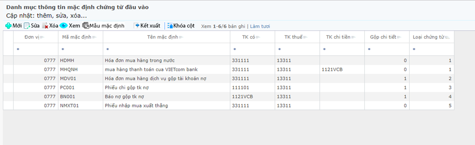 Mẫu chứng từ hoá đơn đầu vào trên Sivip.