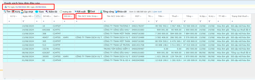 Tất cả các hóa đơn mới lấy về có màu xanh nhạt, chưa được xử lý. Đối với các hóa đơn có nhà cung cấp/ khách hàng mới và hàng hóa, vật tư mới chưa khai báo trong danh mục Sivip thì người dùng cần tiến hành khai báo.