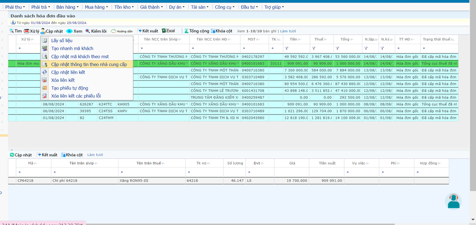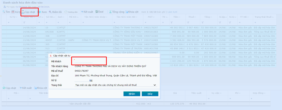 Đặt trỏ chuột vào dòng hóa đơn cần khai báo NCC, KH và bấm Cập nhật rồi đặt mã khách hàng .