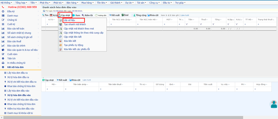 Bấm Cập nhật –>Lấy số liệu để tải hóa đơn về.