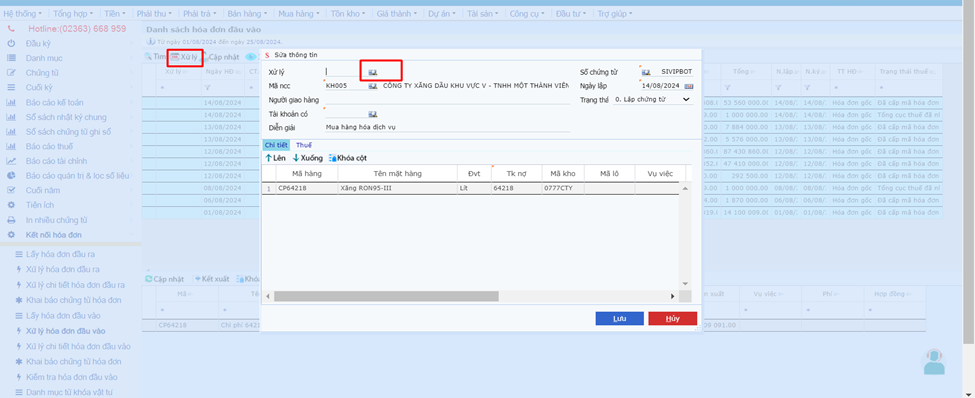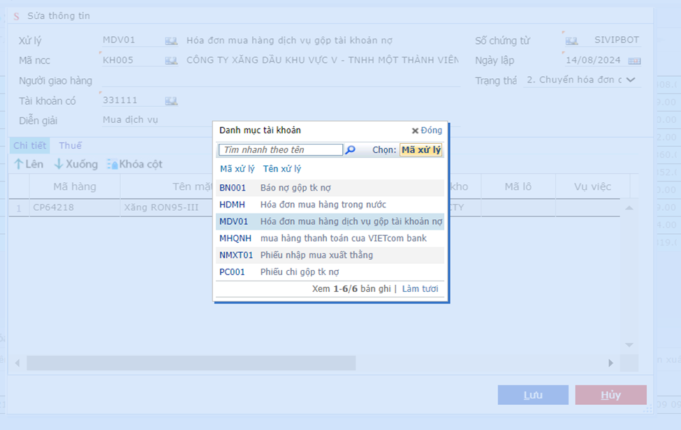 Bước 3: Tiến hành xử lý, đưa các hoá đơn đã có đầy đủ thông tin NCC, KH và mã hàng hoá, vật tư về chứng từ phù hợp trên phần mềm Sivip.