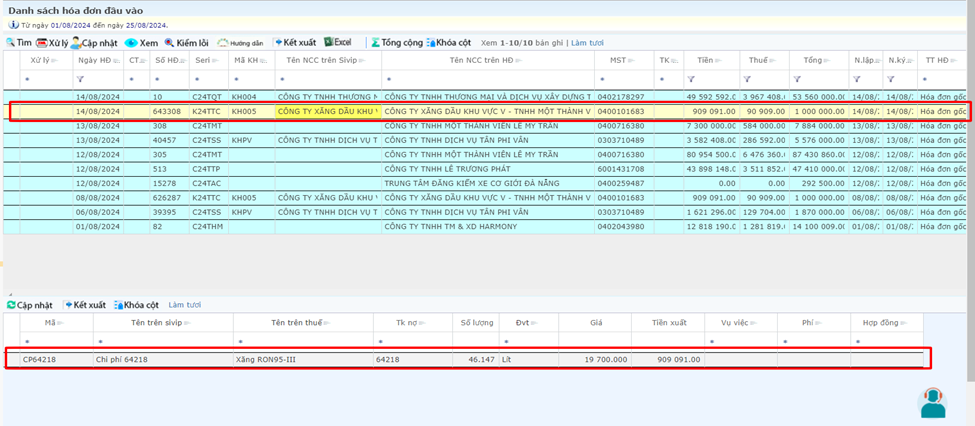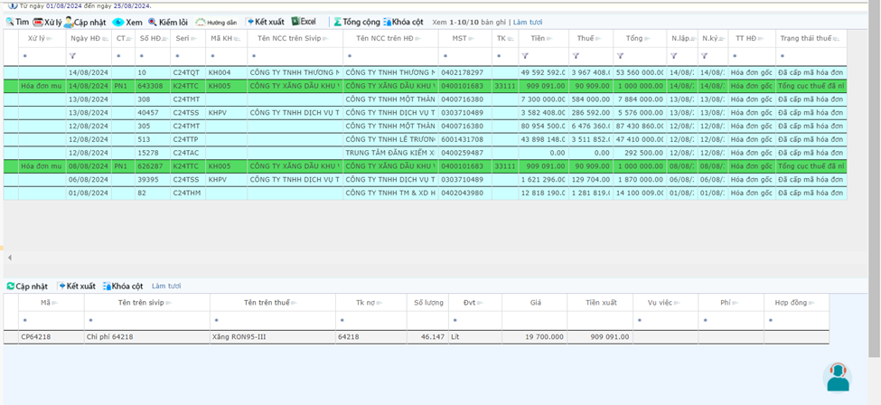 Sau khi xử lý, dòng thể hiện hóa đơn có màu xanh lá cây. Mã chứng từ đã xuất hiện trên dòng hóa đơn.