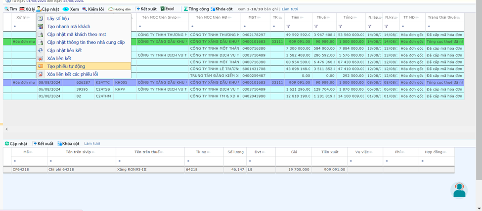 Bước 5: Tiếp tục đặt chuột ở dòng hóa đơn đã xử lý(màu xanh lá cây) .Bấm Cập nhật ->Tạo phiếu tự động, tất cả những hóa đơn sẽ dc tự động xử lý, học theo hoá đơn mẫu và đưa về cùng loại chứng từ.
