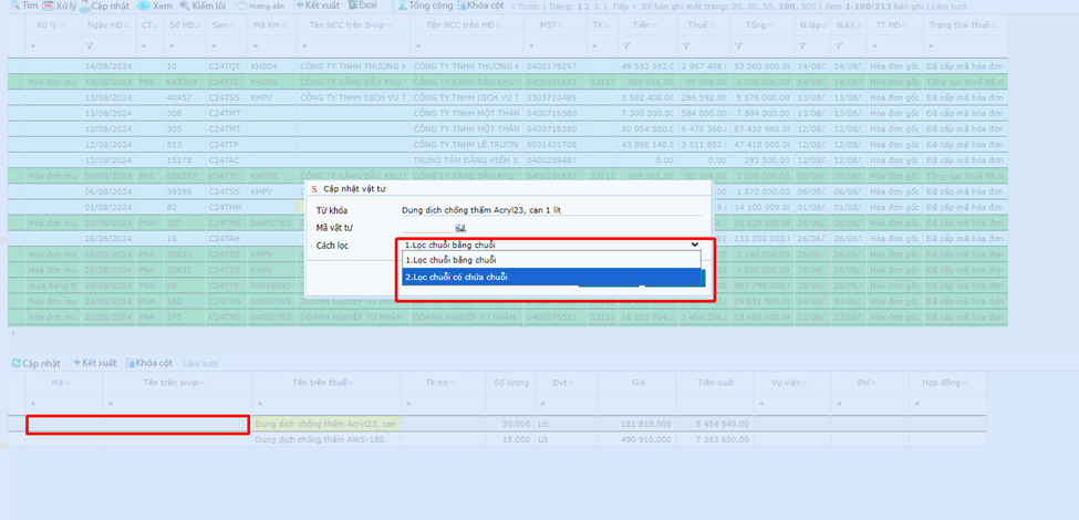 Lưu ý: Đối với những trường hợp mã hàng hoá dài, dịch vụ mua ngoài không cần ghi rõ chi tiết( như dịch vụ Internet từng tháng, dịch vụ ngân hàng….) người dùng có thể đưa về chung 1 mã vật tư, lấy từ khoá đại diện( ví dụ: phí Internet, phí Ngân hàng..) và chọn cách lọc số 2. Lọc chuỗi có chứa chuỗi để sau này, cứ gặp chuỗi thông tin trên hoá đơn có chứa từ khoá đó, Phần mềm tự động quy ước nó về mã vật tư đã khai báo.